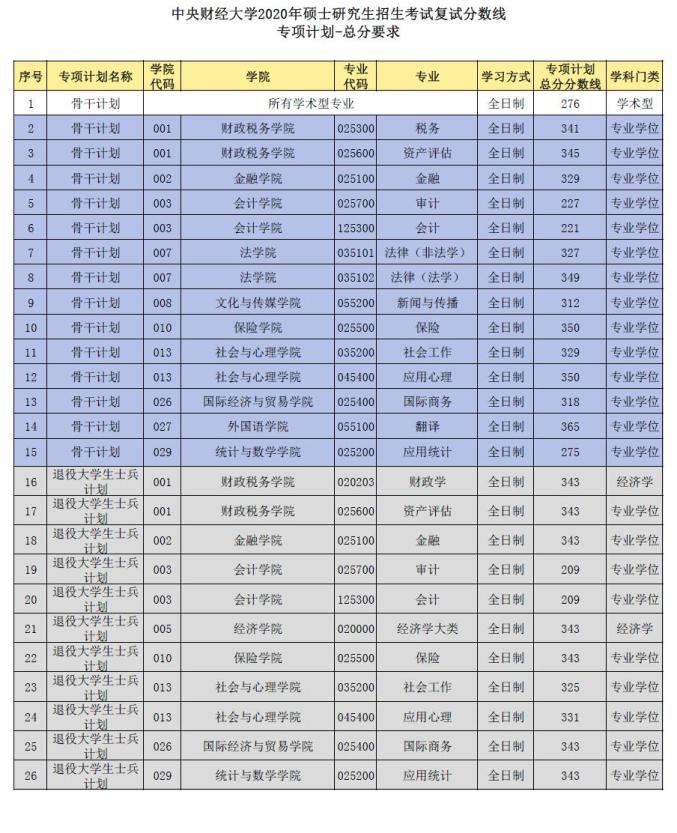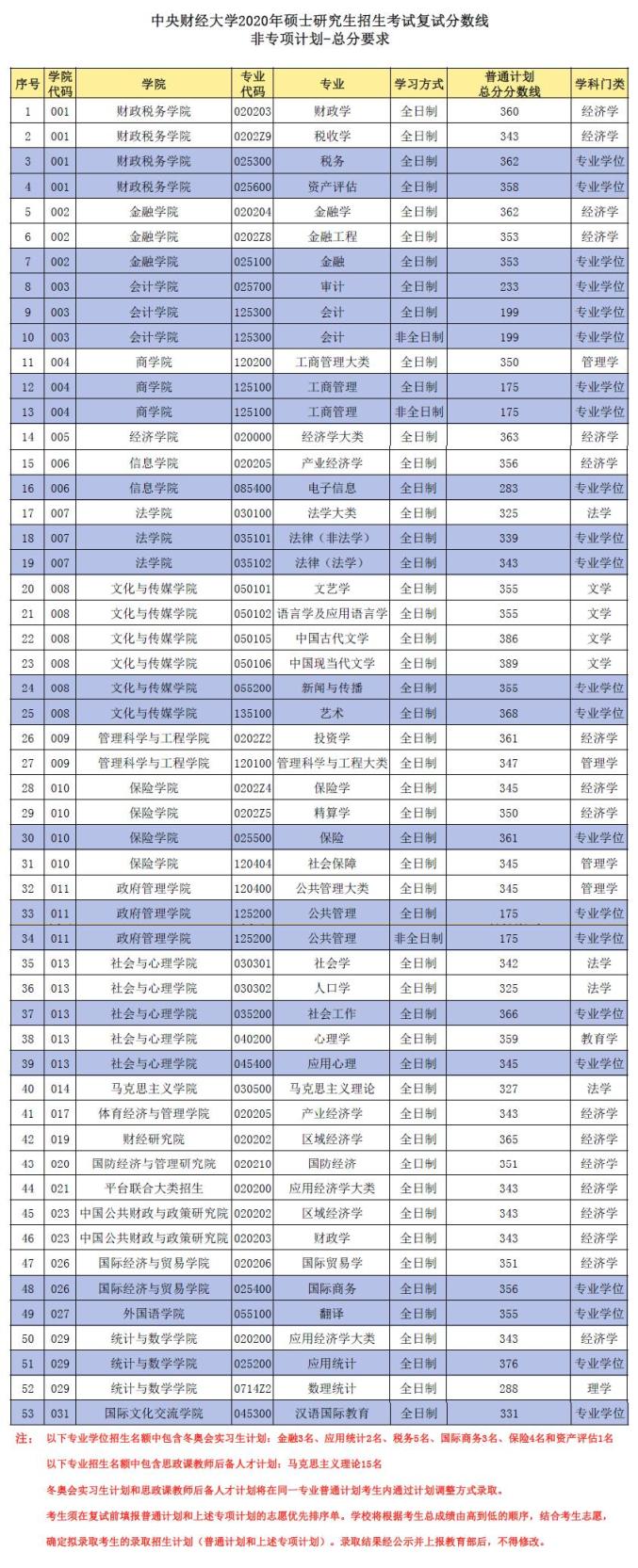 中央财经大学2020年硕士研究生招生考试复试分数线